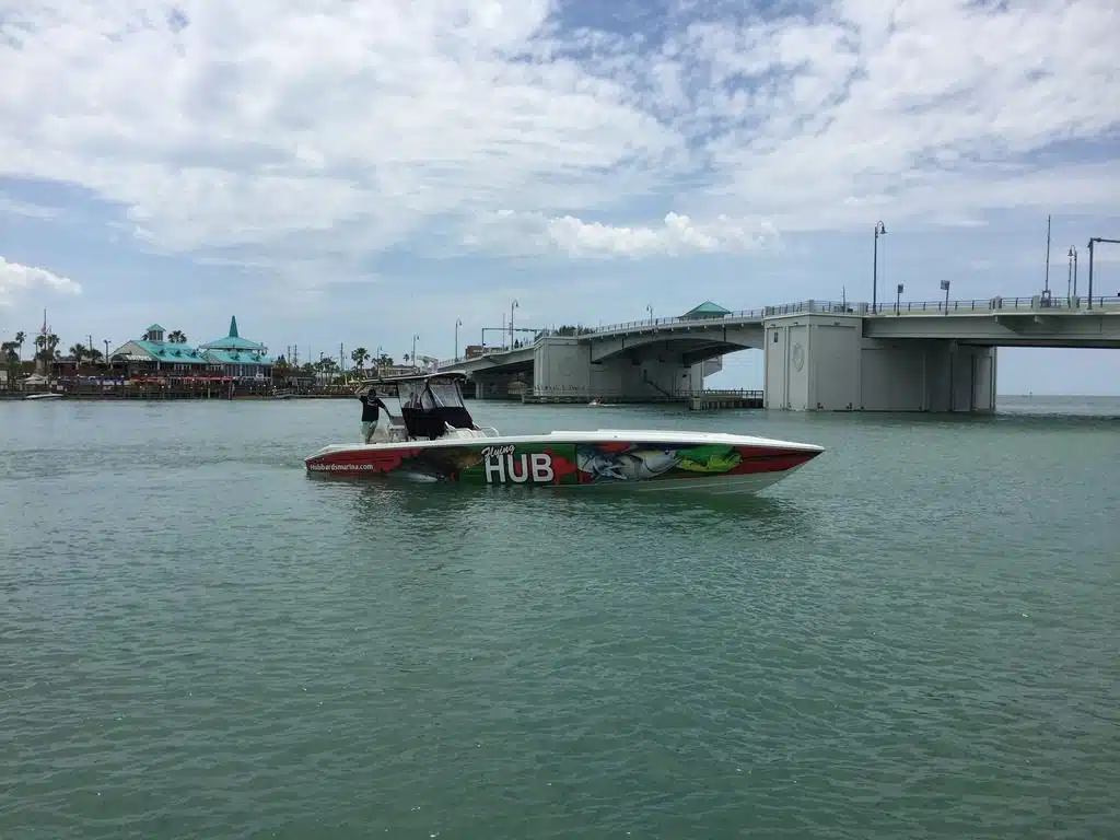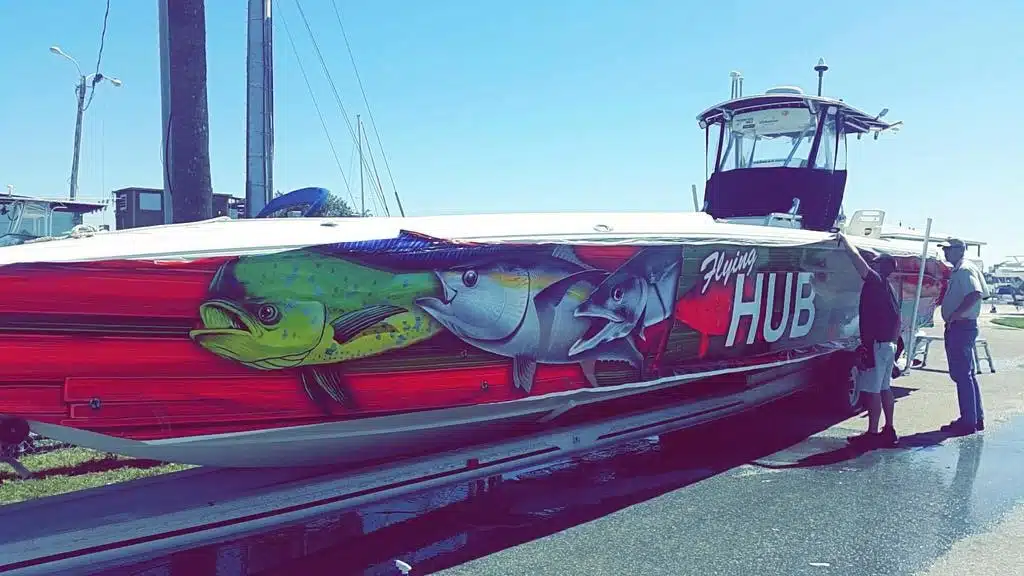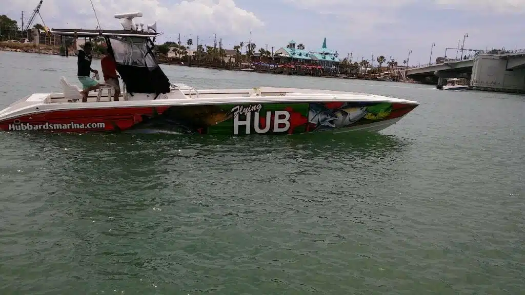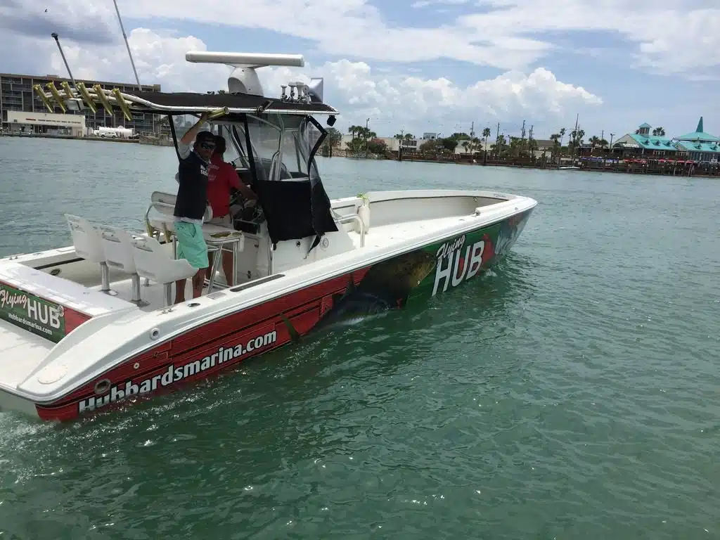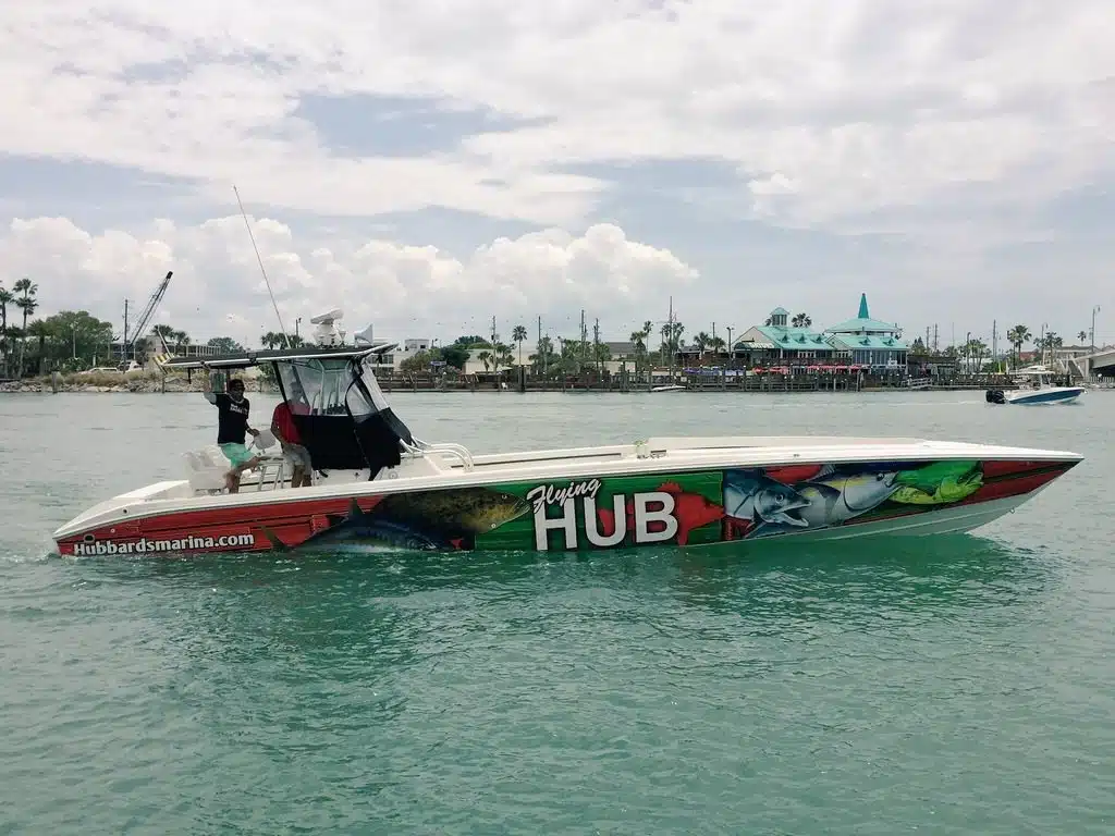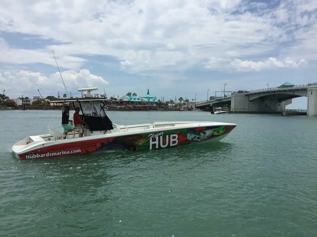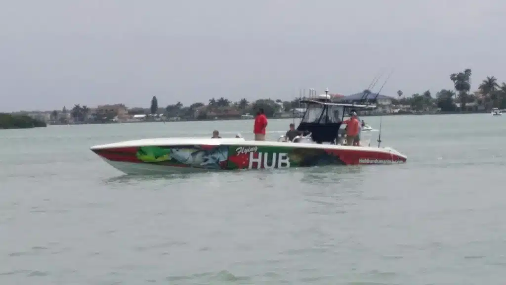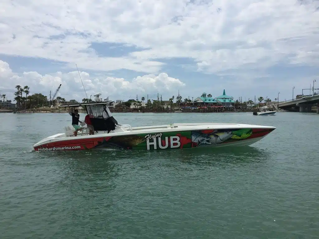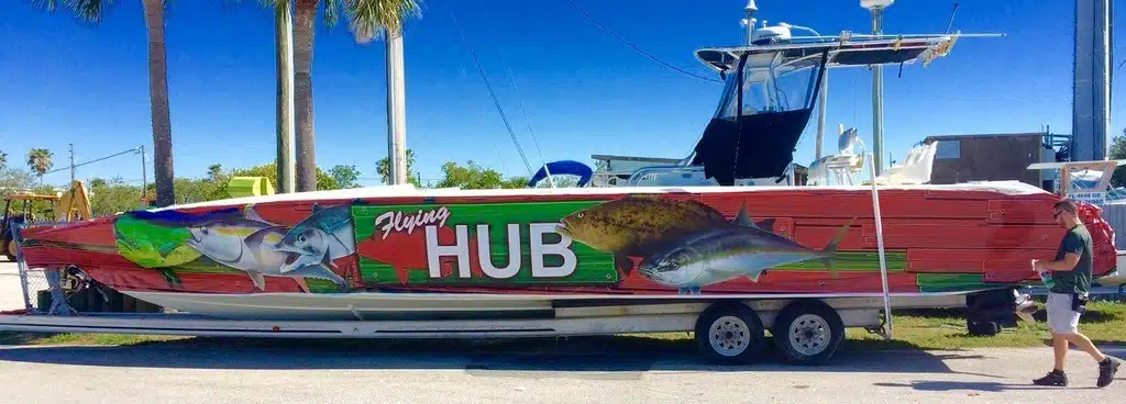 The Flying HUB 1 is a go fast center console fishing machine meant for long range, extreme private charters to target the trophy deep water fish. This boat is a custom built Phantom speed fish hull that is very long and skinny to allow very fast cruising speeds in nice to fair weather.