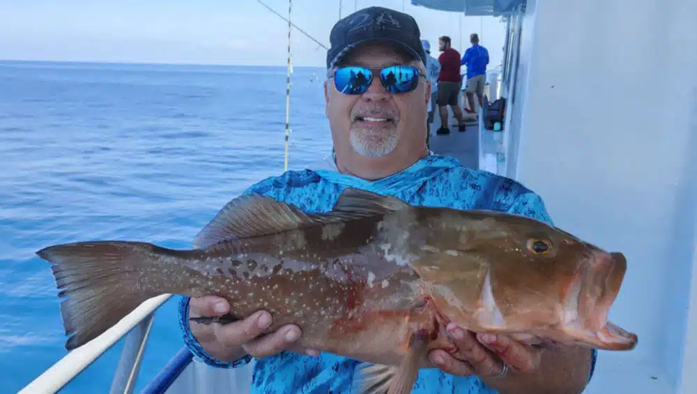 Scamp grouper are possible when we are closer to that 120ft or more mark. Typically on the medium pinfish or cut threadfins we see some nice scamp. They love biting the mangrove snapper set ups typically as they can be a little leader shy.