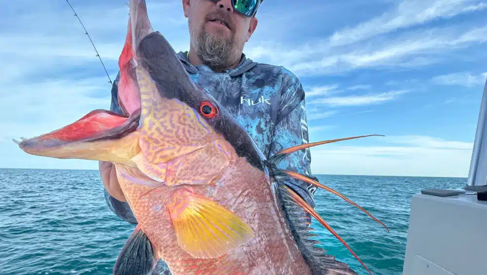 Near shore has been a great fallback when offshore gets sporty, and often its been a little too rough to go deep but still possible to get near shore to the hogfish areas. Hogfish are turning on in 40-60 feet around hard bottom and small ledges. Live shrimp is the ticket, and lighter tackle helps: 20-30 lb braid, a long 10-15 foot fluorocarbon leader around 30 lb, 3/0-4/0 hooks, and a 1-2 oz egg sinker on a knocker rig. However, lots of folks use hog balls or jig heads to target them too with success.