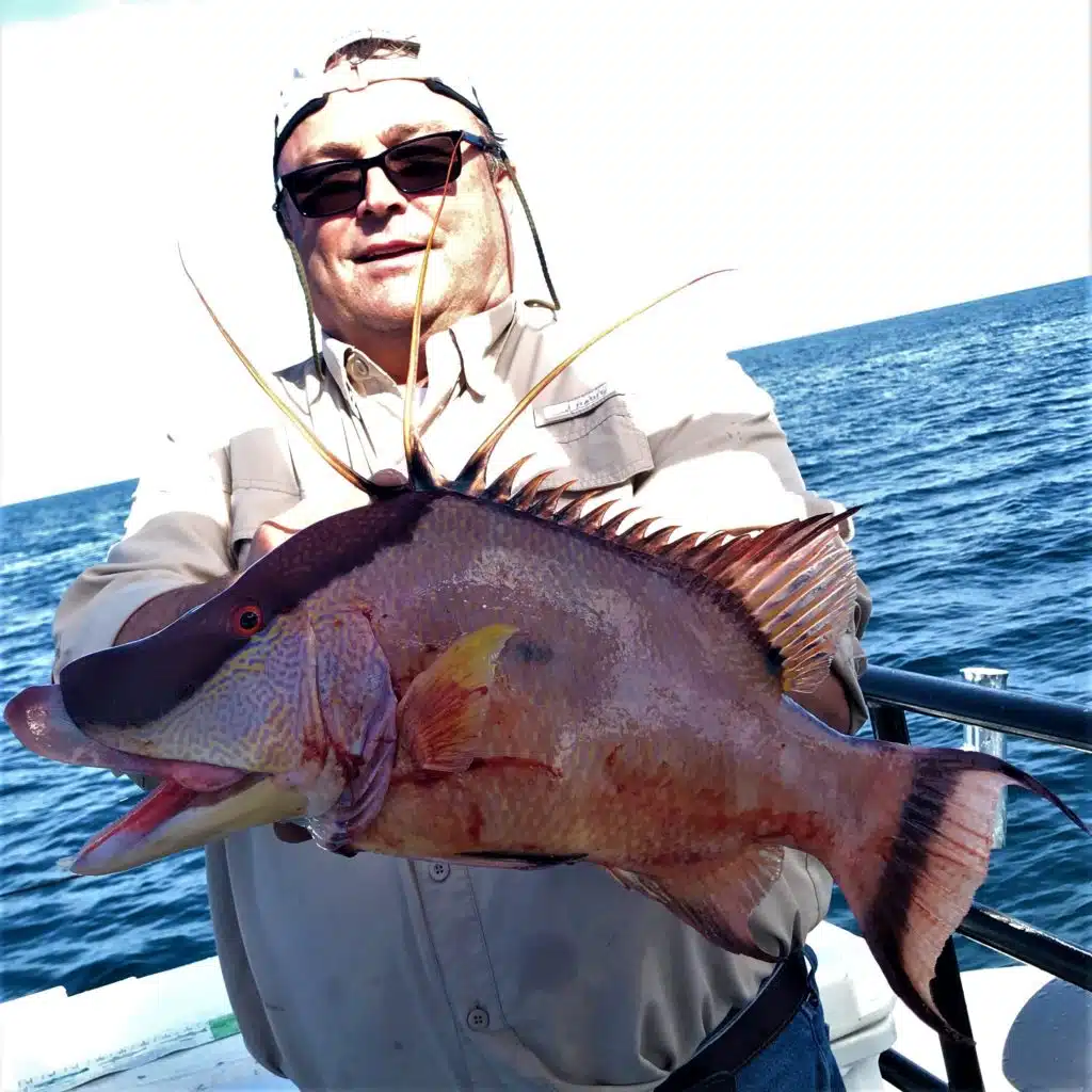 Near shore- The fishing this past weakened and the start of this week was good near shore we were doing very well on mangrove snapper with the occasional hogfish mixed in as well. Plus, the sheepshead are still scattered in our near shore waters too. Hogfish seem to be hanging shallower primarily around 30-70 foot of water, while the mangroves are out deeper in 70-90 foot of water. Hogfish love the live shrimp or fiddlers while the mangroves like big shrimp or small pinfish or cut threadfins. I prefer the double snell rig for mangrove snapper with 4-5ot hooks and 40lb floro. For hogfish, I like a knocker set up with a single 4ot hook and 30lb floro carbon and the lightest possible weight that is going to allow me to feel the bite effectively. Lane snapper have also been biting well near shore from 60-100 foot of water on shrimp or pieces of squid and occasionally that cut dead bait, we often catch these as bycatch while targeting the hogfish or mangroves using the techniques above!