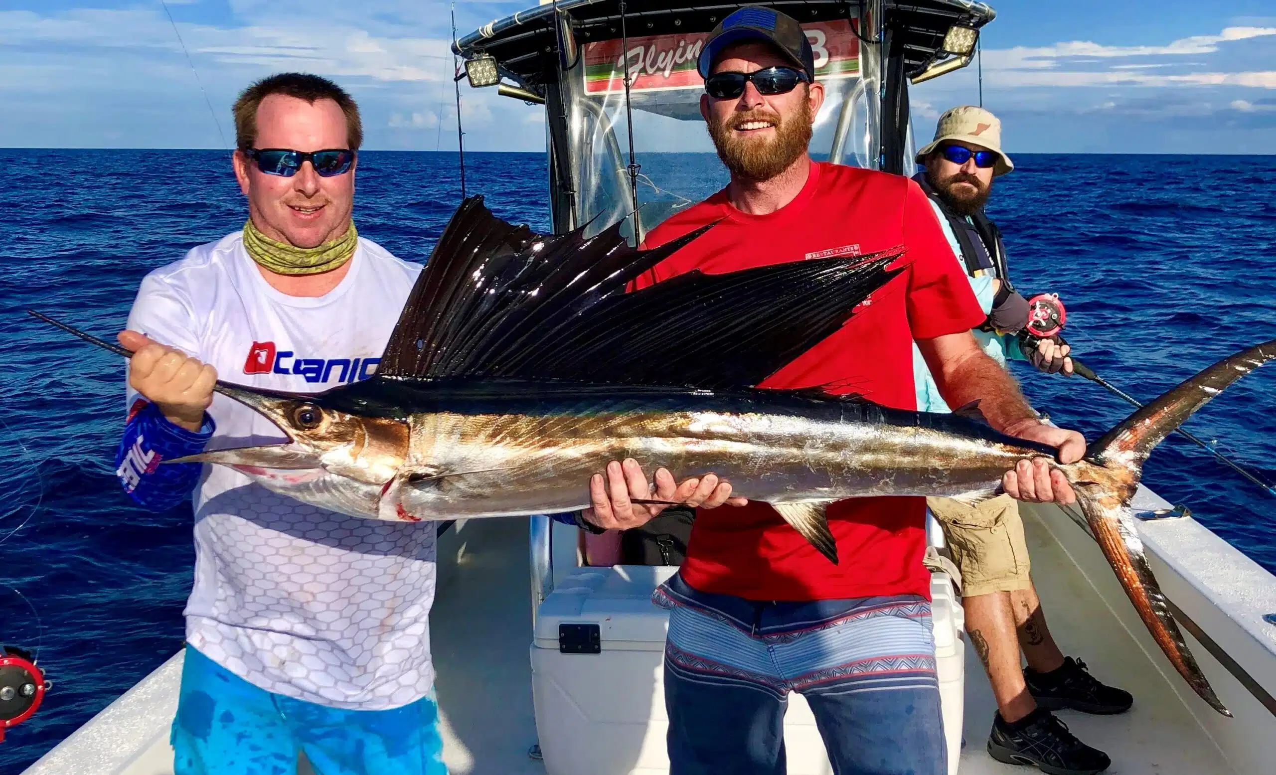 Offshore – Yet again the best action we are seeing is out deep! We have another week of red snapper fishing ahead before they are closed for the year, unless an extension gets announced. Due to this, we are still fishing around 150-200ft of water or more nearly all the time on our 12 hour extreme trips, 39 hour long range overnight trips and our long range private fishing charters aboard the Flying HUB 1 and Flying HUB 2. This week we have nailed some truly trophy fish like a nearly 44lb gag grouper and a beautiful sailfish we caught and released and a handful of nearly 20lb red snapper too. The big mangrove snapper have been biting well but they are a little hit and miss right  now, depending on if the weather allows us the opportunities to dial in on the mangroves. If its not the current holding us back its been stormy, rainy and windy weather holding us back from getting the mangrove bite fired up. However, early this week on the Sunday 39 hour private charter they had the great weather we needed and some very experienced anglers on board and they brought home a mess of nice mangrove snapper in the 7,8 and even 9lb range with the jackpot mangrove nearly 10lbs.  The sailfish we caught and released was caught by accident really aboard a Flying HUB 1 private fishing charter by Capt Joe Drew. He was dropping down a threadfin while targeting fat red grouper and red snapper around 170ish foot of water and as soon as it hit bottom on his first stop of the trip he thought he’d hooked a big grouper since it was taking a run for the bottom and he was using big grouper tackle so he put the heat on the fish cranking like a mad man and lifting as hard as he could. Once he got the fish off the bottom he thought he had a 20+lb red grouper coming up when all of a sudden it took off on a huge run. Then on the other side of the boat a guest yells ‘sailfish’ as we could see it tail walking on the surface 50-60yards from the boat. He quickly moved to the opposite side of the boat under the anchor line and realized he had hooked a beautiful fish instead of what he now thought was a big bonita. Once he got clear of the anchor line the line was slack and for a second he thought he had lost the fish due to a spit hook. Luckily, he didn’t give up reeling in the slack as quickly as his big 9ot would go and all of a sudden as the line came back tight the fish appeared at the side of the boat almost to say ‘he you win, lets end this early and get me back in the water’. They were able to hoist him into the boat for a quick photo and hook release and get him back in the water expeditiously. Since it was such a very quick fight and expert hook release while taking a photo that fish swam off very strong and even did a few free jumps as if to say ‘thanks for getting be back quickly’ before disappearing out to the west. The nearly 44lb gag was 43lbs and change caught on the 39 hour long range overnight trip early this week. The gag bite prior to the full moon mid July was very good and then it slacked off a bit around the moon and now it seems to be heating back up for us out deep closer to the 200ft mark. This huge gag was one of many caught aboard this particular 39 hour fishing trip. Andrew Campos was the skilled and very lucky angler to boat this monster gag grouper using a slow pitch jig on a crazy ultra light jigging rod with only 30lb test and a very small sized reel! Crazy catch for sure on such a unique set up but that’s what these jig fisherman use to land some truly awe-inspiring catches and as the slow pitch jigging scene continues to grow after stories like this we continue to see more and more epic fish caught on some tackle that looks like it couldn’t handle a 10lb bass at your local golf course pond.