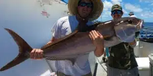 Offshore – Red snapper are closed and Amberjack are the new focus for the next three months while we can get them! However, many are still focused on the gag grouper that remain open through the end of the year. Amberjack bite is going okay out there in the deeper waters past 150ft of water up to around 300ft but were targeting around the 200ft mark on big springs, wrecks, or large ledges to find them. The difficult part of amberjack fishing is that there’s just not that many big wrecks or springs out there that are holding big numbers of keeper jacks and if you aren’t the first boat offshore and on the spot often you are left with batting cleanup behind another boat that’s fished the spot and your left with only smaller jacks to catch. This makes Amberjack fishing on the weekends nearly impossible unless you leave the dock early or you’re already out there like our 39 hour and were able to move onto the spot early. These fish bite primarily during the day and that sunrise bite is typically very good for the amberjack. They need to be 34 inches to the fork which is a monster fish and your only allowed one per person per day. You can use a large vertical jig, huge live bait, or sometimes even troll to find these amberjack. The easiest way to get them is a big live bait like a blue runner, spadefish, big mullet, or even a porgy. You want to use around 100lb test up to 125lb test with a huge 9ot reel or 50-80wide two speed reel with around a 10-12ot hook. You can vertical jig for them but that is a lot like work since you have to use a larger rod and reel to fight the big fish you are trying to hook while jigging and working a big rod and reel with a jig is no fun after a while. I like to drop a jig down at the start and if they don’t fire up right away I will switch to the big live bait method and if it slows down on the live bait bite then I will move back to the jig. Often while reeling a big one to the bottom others will follow it up and you can sometimes even catch a jack off the back of a jack your buddy is reeling in using a vertical jig dropped accurately near the jack being fought to the surface. However, you do run a big risk of tangling using this method but it does make for fun fishing! The gag grouper bite is going pretty good too and for this time of year it’s actually going very well. Typically we don’t see too many gags until the waters cool way down but we have been pretty lucky this year we decent gag grouper catches around that 180-200ft mark. Plus, mixed in with the gags we have seen some good action on the scamp grouper too! Great time to get offshore and go fishing out deep for some amberjack, gags and scamp. The mangrove snapper bite has been a little hit and miss but we are finding some decent numbers when the current isn’t making catching them effectively harder than it already is. This summer the full and new moon has consistently brought extreme currents into our area which make feeling those quick biting and smart mangrove snapper very difficult. The pelagic action was a bit slower for us this past week offshore but we should still have some tuna around the area and the kingfish will start getting more prolific soon as the water cools.