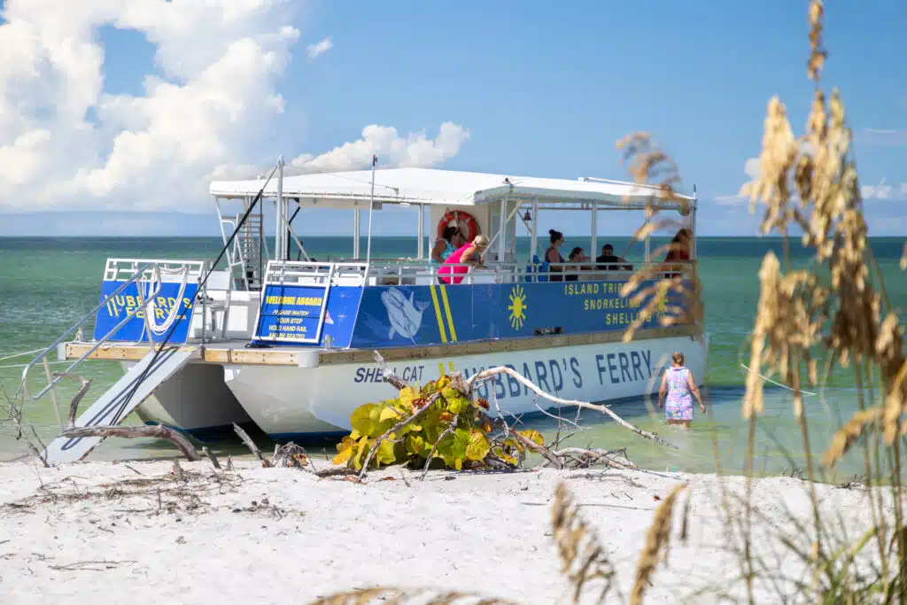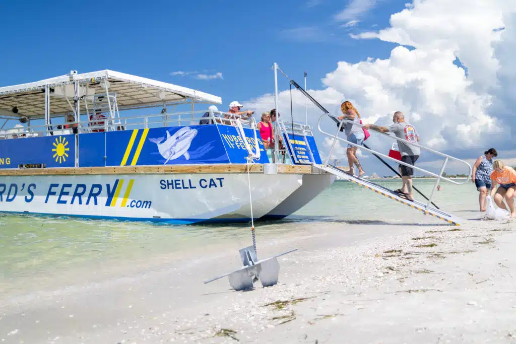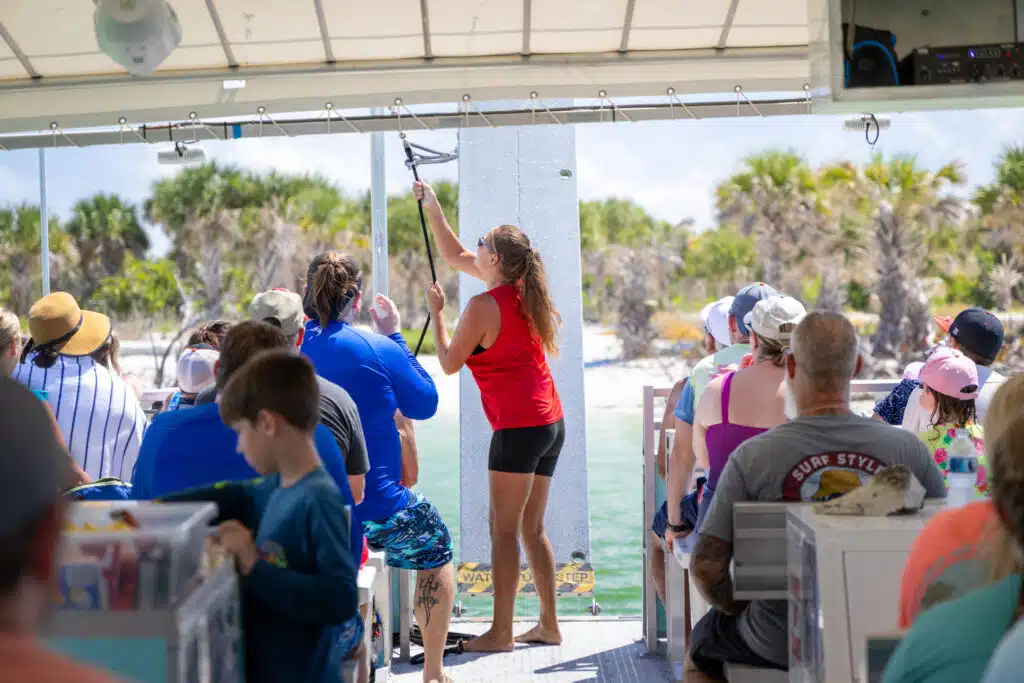 The ShellCat 49′Â is our Hubbard’s Custom Built catamaran. Built with an open-air spacious deck featuring bench and bleacher style seating for up to 49 people. Designed to offer a full 360-degree view, you’ll never miss seeing the next dolphin jumping out of the water, or get up and close to a manatee and it’s babies swimming under the boat. This boat also has a walk-in style bathroom at the stern.